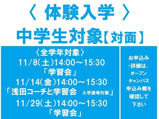 体験会2025-11-14 14:00〜15:30 【中学生3年】浅田コーチと挑む!入試対策スペシャル in 埼玉県民の日 11月14日、埼玉県民の日に開催される特別学習会では、浅田コーチによる“入学選考対策スペシャル”を実施!