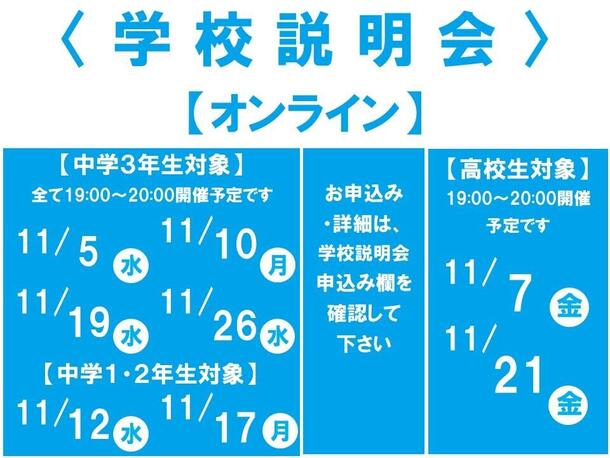 WEB説明会2025-11-17 19:00〜20:00 【中学1・2年生】【ナイトオンライン学校説明会】 「来年に向けて今から準備!」夜のオンライン学校説明会 こんにちは!
