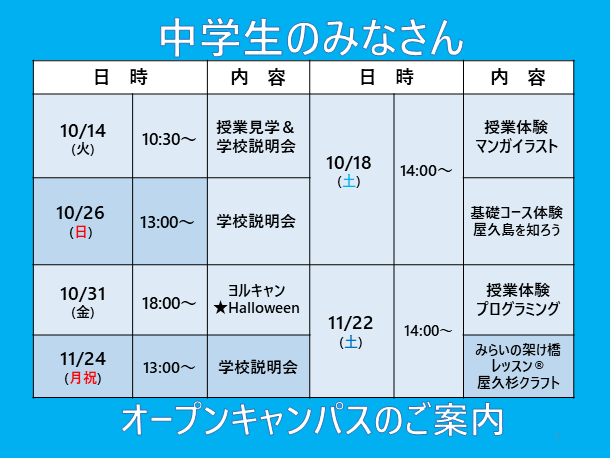 オープンキャンパス(体験入学/学校説明会)開催日程