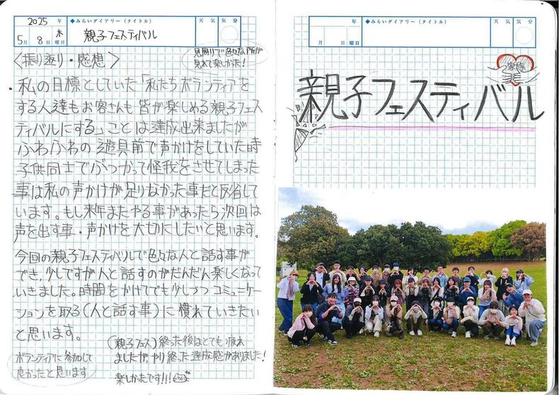 活動する、だけでなく、ノートへ自分の気持ちや感想、変化をよくまとめてくれています。ただ振り返ってまとめる、だけでなく、そこから自分の課題を見つけていたり、次にやりたいこと・チャレンジしたいことまで記載していることは大人でも頭が下がります。これが経験へつながります。