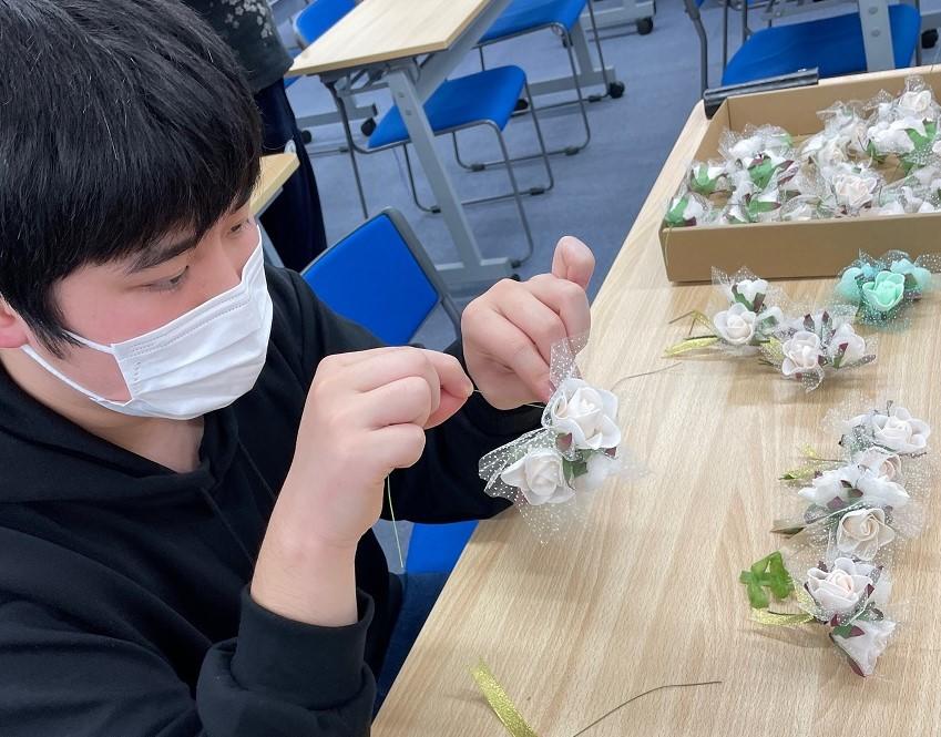 コサージュは将来の安全や健康を守る願いが込められているものだそうです。それを卒業生一人ひとりに向けて作るので、みんな真剣です! これまでの感謝の気持ちを込め、よい卒業式になるように生徒と一緒に準備を続けていきたいです。