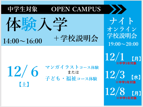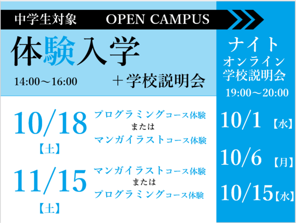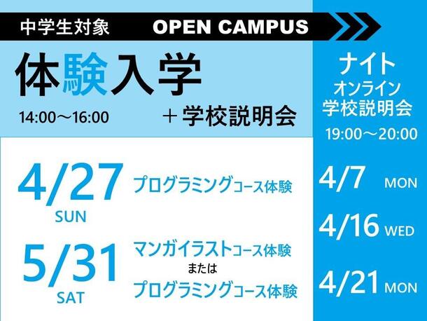オープンキャンパス(体験入学/学校説明会)開催日程