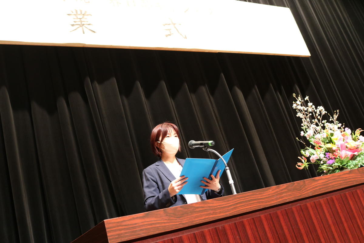 「この高校生活で得たものはたくさんあります。その中でも私が大切にしているのはコーチの教えです。私はコーチから【やりたいこと、やるべきこと、くだらないこと】を教わりました。そこで私は将来、青年海外協力隊に入り、国際協力の現場で働きたいと考えるようになりました。この夢を見つけることができたのも、コーチのおかげです。また、友人や先輩、後輩からも色々なことを学びました。そして、卒業まで支えてくれた両親に感謝します。ここで得た経験をいかしながら、未来に向かって進み続けたいと思います。3年間ありがとうございました」