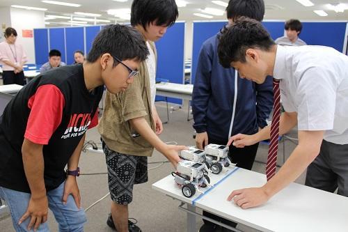 プログラミングの基本を学んだ後、自分たちがプログラムしたロボットを使って競争。決められたルールの中で、自分自身で試行錯誤し、何度も挑戦する姿を見ることができました。