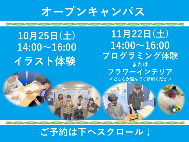 倉敷キャンパスでは、そんなみなさんに自分に合った学校探しのきっかけにしてもらえたら!ということで、オープンキャンパスを開催します!今回のオープンキャンパスでは、①プログラミング体験 または ②オリジナルリースづくり体験 を行います!どちらか選んでご参加いただけますので、体験を通して倉敷キャンパスの雰囲気を感じてください♪また、在校生によるインタビュータイムもご用意しています♪もちろん学校説明も行いますので、ぜひご参加ください☆