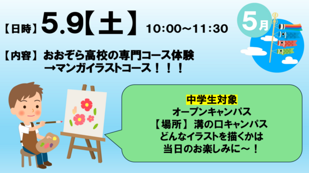 【中学生】中学生対象! オープンキャンパス【体験授業(マンガイラスト)と学校説明会】 ~今年は受験生になる皆さん、あなたは高校でどんなことを学びたいですか? 実際にリアルな体験をしながら、学校選びができる貴重な機会です~