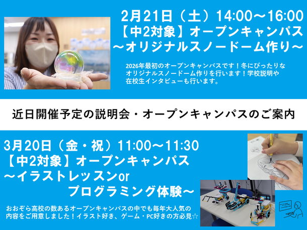 今回のオープンキャンパスでは、2つの内容からどちらかを選んでご参加いただけます。中学2年生のみなさんはもちろん、中学1年生のみなさんのご参加もどしどしお待ちしています!