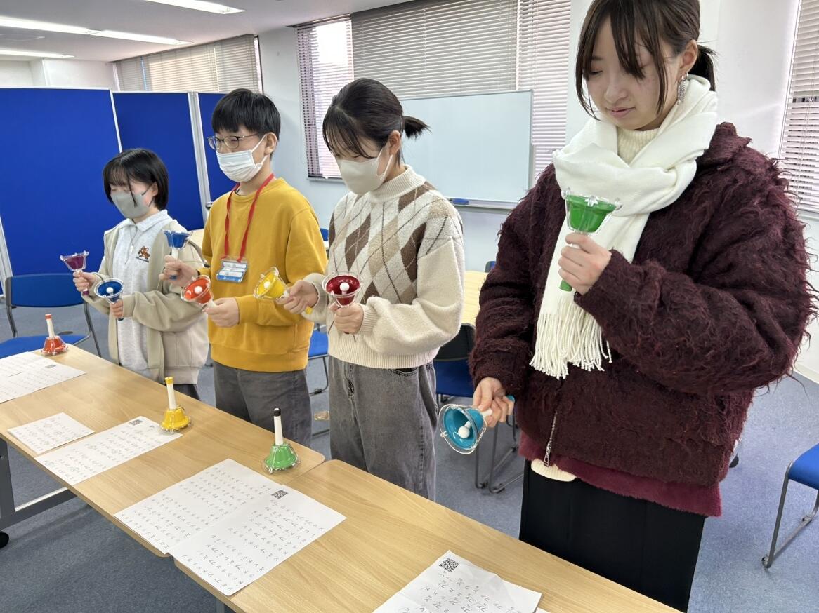 先日児童センターの実習に行った際に職員の方がハンドベルの演奏をしており、そのきれいな音色に魅了され、私たちもやってみようと挑戦することになりました。職員の方からは、五感、特に聴力に訴えかけることのできるハンドベルは子どもにとってとても良い効果があると教えてくれました。