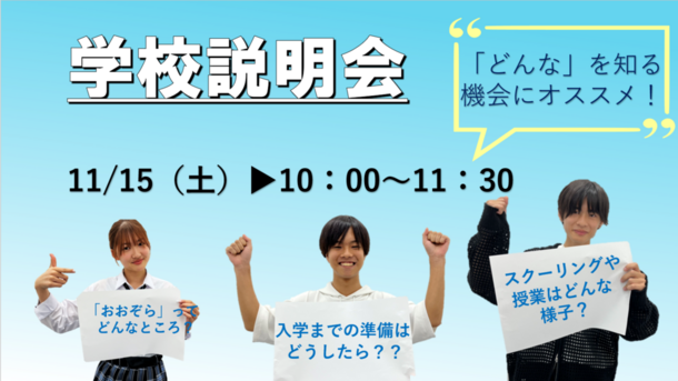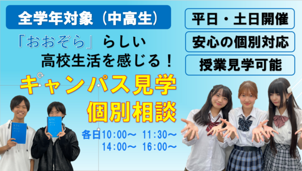 高校生のみなさん、保護者さま、こんなこと思うことはありませんか? 「もっと自分らしくイキイキと高校生活を送りたい」 「今の高校生活の違和感、モヤモヤを解決したい」 「通信制高校へ転校したら、どんな高校生活が待っているの?」 年末も近づき、今の状況に悩んでいる高校生のために、ご自宅で参加できるオンライン学校説明会を開催します! 転校した方がいいのか、今の高校を続けた方がいいのか、 転校するとしたら、転校先はどうやって選んだらいいのか、そのタイミングは? ▶︎イベント詳細 ・場所:オンライン(方法は申込後にご連絡します) ・形式:無料アプリZoomウェビナー(参加者同士の顔や名前は見えません) ・内容:通信制高校のしくみ、おおぞら高校について -