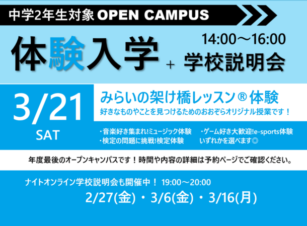 【中学1・2年生】【学校説明会+みらいの架け橋レッスン®「検定」体験】 高校ってどんなところ?体験するときっとワクワク!!あなたの好きが見つかるかも!