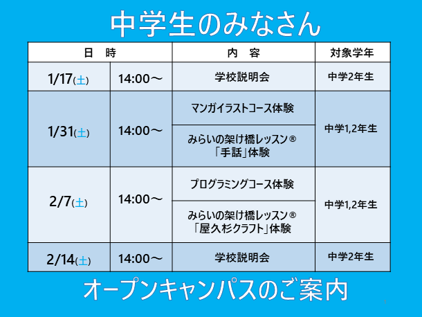 オープンキャンパス(体験入学/学校説明会)開催日程