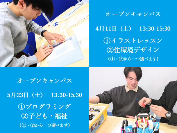 今回のオープンキャンパスは、おおぞら高校でも大大大人気のプログラミング体験/子ども・福祉体験の2つからお好きな方にご参加いただけます。「パソコンやゲームに夢中!」「子どもや老人向けのものづくり」そんなみなさんにピッタリの内容となっております♪もちろん学校説明も行いますので、おおぞら高校について少しでも気になることがある。聞いてみたいことがある、そんなみなさんのご参加をお待ちしております。進路について考えている中学3年生のみなさんはもちろん、早めの高校探しをお考えの中学1、2年生のみなさんのご参加もふるってお待ちしております^^ -
