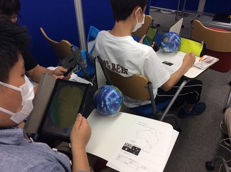 このミニ地球儀にタブレット端末をかざすと、地球上の現在の気候などがリアルタイムで表示される教材です。