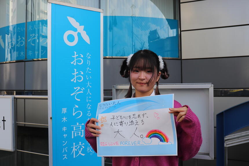 僕は子ども心をを忘れず人に寄り添い、楽しい方へ連れて行ける大人になりたいです。理由は、僕が小学生、中学生時代などに大人に気持ちをわかってもらえないことがあったという経験から、子供や人の気持ちに寄り添いつつ楽しい方へ引き連れていける大人になりたいと思いました。そのために今子どもと関わるバイトをしているので一人一人の気持ちや話をちゃんと聞いていこうと思います。