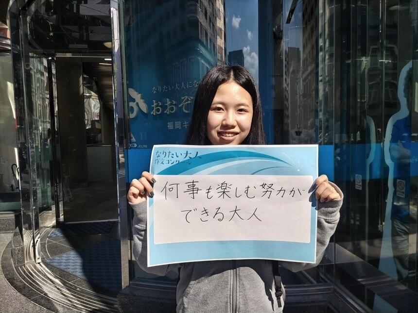 私は、何事も楽しむ努力ができる大人になりたい。私の父は毎日どんなに忙しくても笑顔を絶やさず優しく見守ってくれる人で、私もそんな大人になりたいと思ったから。嫌な事があったとき、自分なりの息抜きの仕方を見つけて、いつでも笑顔で楽しめるように努力していきたい。今はまだ、ネガティブで感情的になってしまうことが多いけど、自分を認めてあげながらなりたい大人に近づきたい。