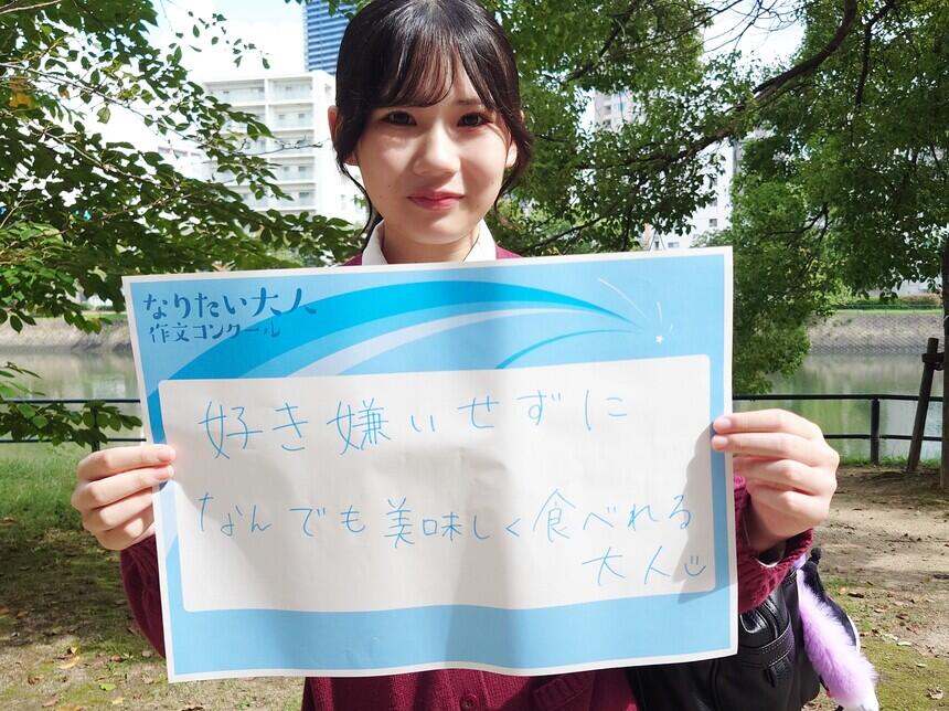 私は好き嫌いせずになんでも美味しく食べれる大人になりたいです。昔から食わず嫌いなのもあって苦手な食べ物がすごく多くてその度に家族に食べてもらっていました。でも、世の中には美味しい食べ物が沢山あるのに食わず嫌いで美味しいか分からないから食べないなんてすごくもったいないと思ったので少しずつ色んなものに挑戦して沢山のものを美味しく食べていきたいと思います。