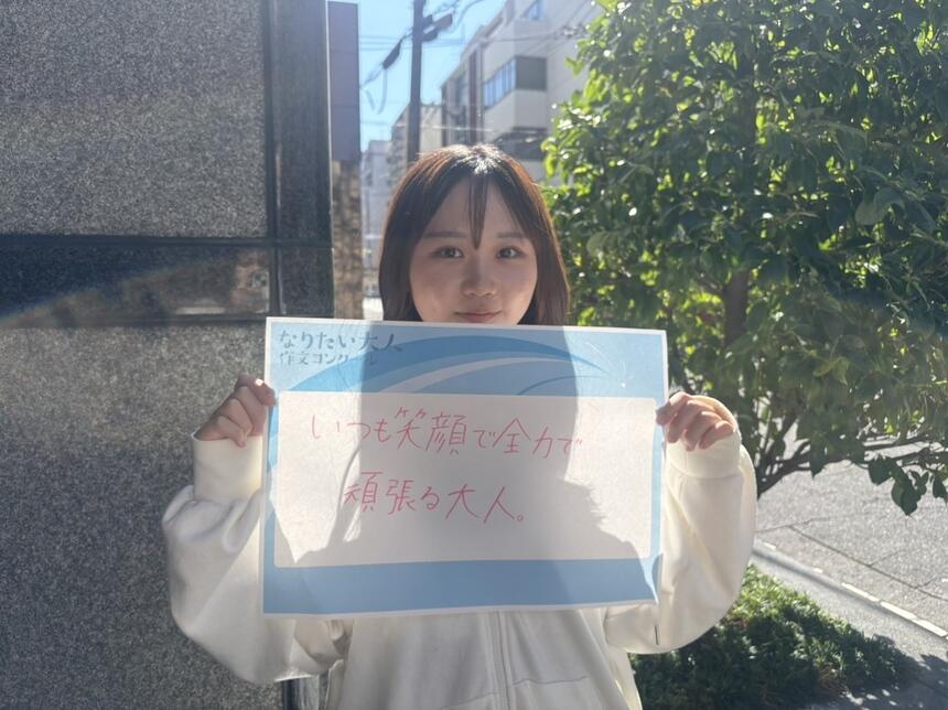 私のなりたい大人は「いつも笑顔な大人」です。自分が笑顔でいると周りのみんなも笑顔になって楽しく過ごせるしポジティブになれるからです。1番の目標は自分の行動や言動で周りを笑顔にできる大人になりたいです。大切な1日を通して少しでも笑顔で過ごせる時間を増やしたいと思ったからです。なので私は「いつも笑顔な大人」になりたいです。