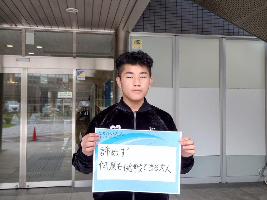 目標に向かって、何があっても、挑戦する大人になりたいです。理由は、陸上をいままでやってきて目標に向かって練習などをしていく中で、ケガなどをしてしまって、挫折しそうになったりしたけど、あきらめずに練習に取り組んで目標を掴むことができたから、大人になって、色々な困難などは絶対出てくると思うので、そう言う時は何度も挑戦して目標を掴みたいです。