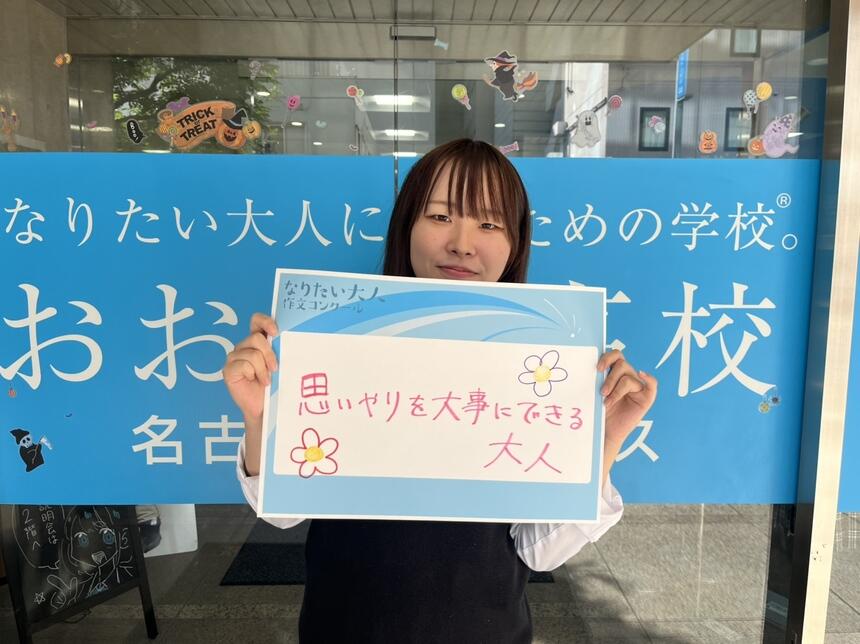 私は、自分のことも、周りの人も思いやることができる大人になりたいです。私は自己理解が足りず自分で自分を追い込んでしまう事が多いので、まずは自分のことをしっかりと分かってあげて、大切にできるようになりたいです。その上で、次は周りの人にも思いやる心を持って関わっていけたら、きっとみんな気持ちよく過ごせるんじゃないかと思います。なので私は、自分と周りの人を思いやることができる大人になりたいです。
