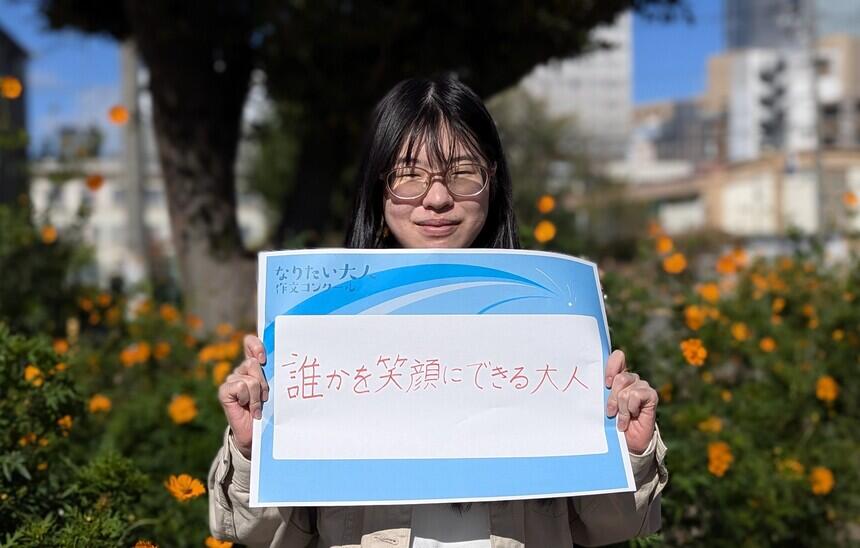 私は誰かを笑顔に、夢を応援して手伝える大人になりたいです。理由は、私も人から沢山笑顔をもらえて嬉しかったこと、1人1人の夢は全て大切なものだと考えているので、全力で手伝い1人でも多くの夢を叶えてあげたいからです。そして、悲しむ時間を1秒でも多く笑える時間に変えてあげたいと思いました。だから私は、誰かを笑顔にできる大人になりたいと思っています。