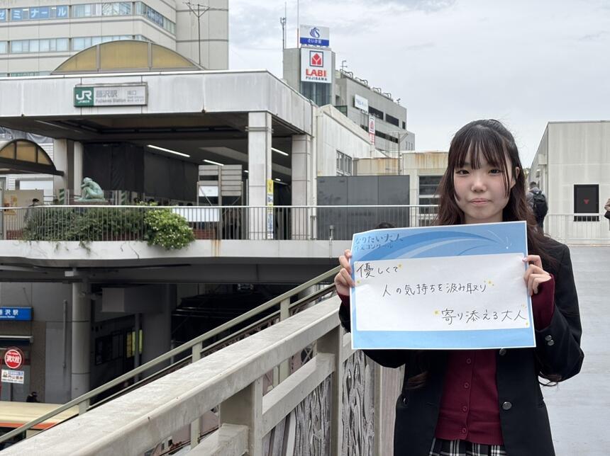 私のなりたい大人像は「優しくて人の気持ちを汲み取り、寄り添える大人」です。私の夢はおおぞら高校のコーチになることです。どんなコーチなら話しかけたいかな?頼りたいかな?と今の生徒側の視点で自分が思う理想のコーチ像を描いた時に、こんな大人、コーチになって生徒に寄り添いたいと思いました。それこそが私のなりたい大人であると共に理想であり夢です。