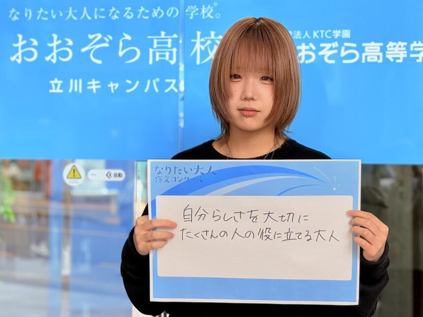 「〇〇のペースでいいんだよ」この何気ないー言がすごく嬉しかった。私に自分らしくいることの大切さを教えてくれた。みんなと同じようにできないこともあるけど、それも私の一部。だからこそ見つけられること、私にしかできないことがあると思う。私は一人ひとりの個性や気持ちを大切に、寄り添いながら支えられる存在になりたい。私もおおぞらのコーチになって声にならない声に気づき、そっと寄り添える大人になりたい。