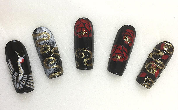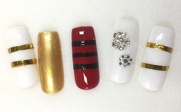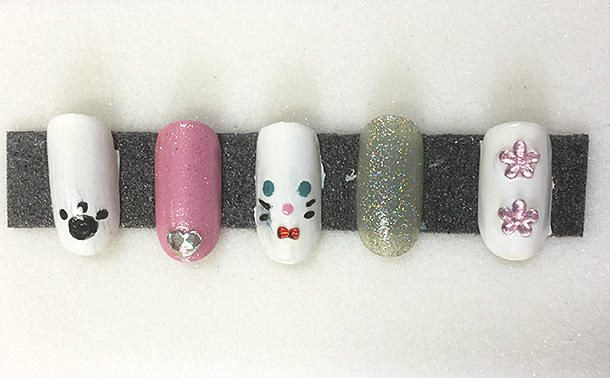 ベースカラーにラメやメタリックカラーを組み合わせてあり、とてもキレイな仕上がりでした。5本そろえて完成させるようなアートも丁寧に描かれていて、アイデア性もありました。