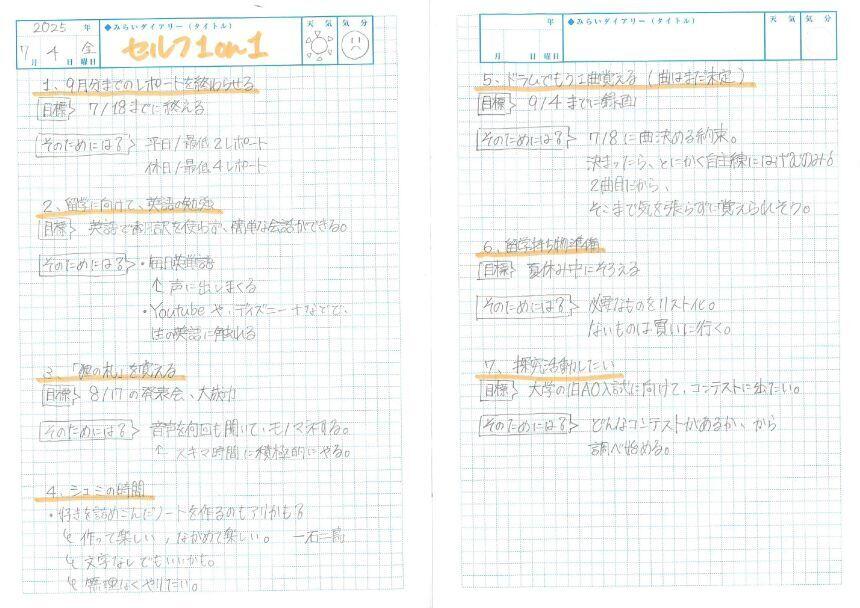 このセルフ1on1のページでは、レポート課題やみらいの架け橋レッスン®の楽器レッスンのこと、さらには将来に向けた思いを書き出し「これからどう行動すればいいのか」を自分の言葉で丁寧に整理しています。Yさんが自分に真剣に向き合っている姿が、そのままページにあらわれていました。