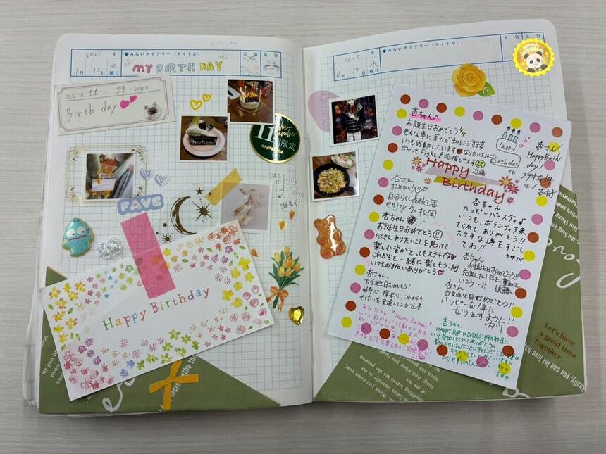 今回ご紹介する杏さんのみらいノートのページは杏さんの誕生日の日のページです。誕生日の楽しかった思い出を、いつでも思い出せるよにたくさんデコろう!!と思って書いたそうです★