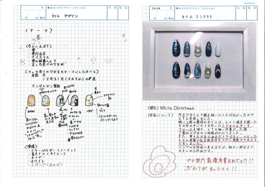 今回のみらいノートはそのネイルのコンテストに出品したときのものです。