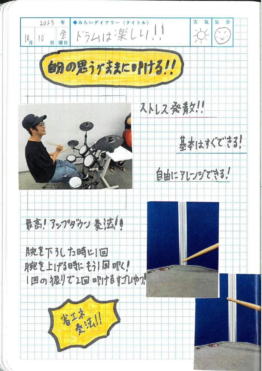 一枚目は、みらいの架け橋レッスンで初めてドラムを始めた生徒がドラムの魅力を語ってくれているみらいノートです。