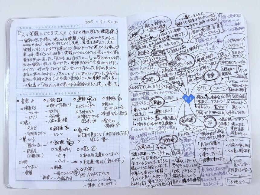 特に好きなこと連想マップには、思考や気持ちがぎっしりと書き込まれ、自分の内側を思いのままに書き出して整理している様子が伝わってきます。